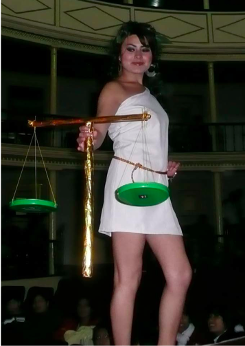 1ra. Pose. LA POSE DE LA BALANZA, porque La Justicia, como es de saber, representa siempre a la balanza, es decir, al equilibrio, pues sopesa los derechos de unos con los de otros, y logra el equilibrio; dándole a cada cual lo que le pertenece o corresponde. Y miren que bien hace la balanza, como juega con sus hermosos brazos para ser la balanza de los que la necesiten, para darle a cada quien su justo peso, lo que le corresponde.